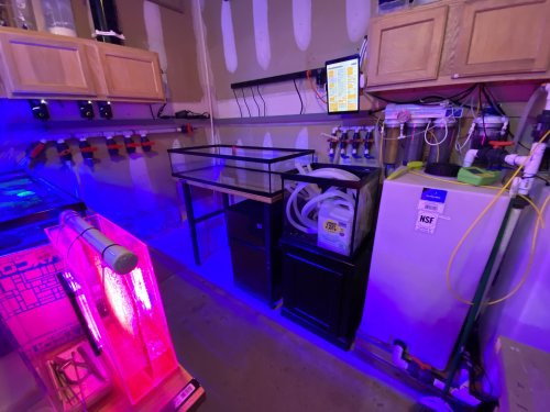 Let me know if you need a sump for that new frag tank lol “iron sharpens iron”The scrubber is in its final location. With the main drain installed I can run at full flow. I still have to measure it but I think I have about 250-300gph running over the screen. One thing down, like 15 more to go.